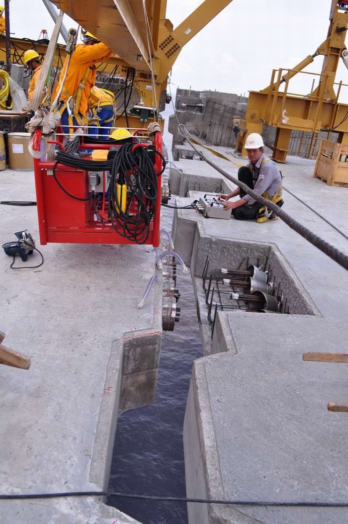 DL-M system being used to align bridge deck segments using a system of hydraulic rams.