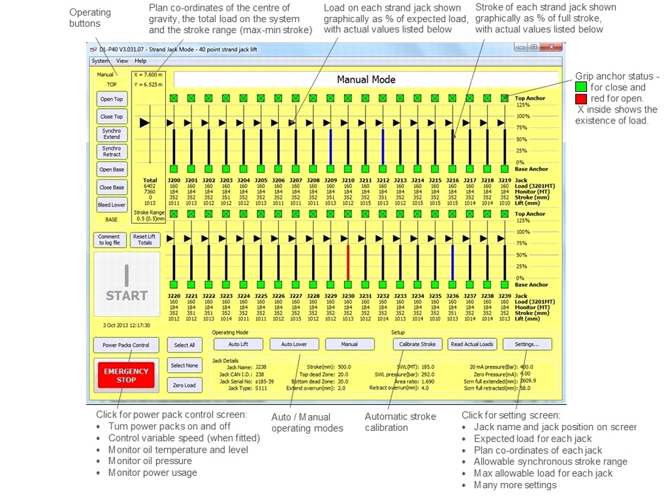 Our DL-P40 Computer control system has been specifically developed to control strand jacks, gripper jacks, climbing jacks and solid rams and is fully developed in-house using feedback from our own operators on site. The system is open and flexible, so can be adapted for a wide range of hydraulic control applications. It uses the latest CANbus network technology for ultra-reliable communication between all jacks, power packs and the control computer and has been tested and certified to the latest European electrical EMC standards. View certificate. The system will automatically synchronise the operation of all the jacks to maintain a level and balanced set of jack loads and has many automated features to ensure a safe lift. During an operation the operator is presented with all the lift data in one clear and easy to read screen, as shown below for a 40 jack lift. The below screen is labelled for explanation of each function.