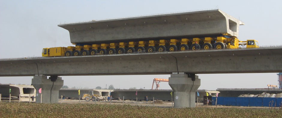 16 Axle line transporter carrying a 900 tonne precast concrete bridge beam supported at each end, with the load distributed evenly over the erected bridge deck.