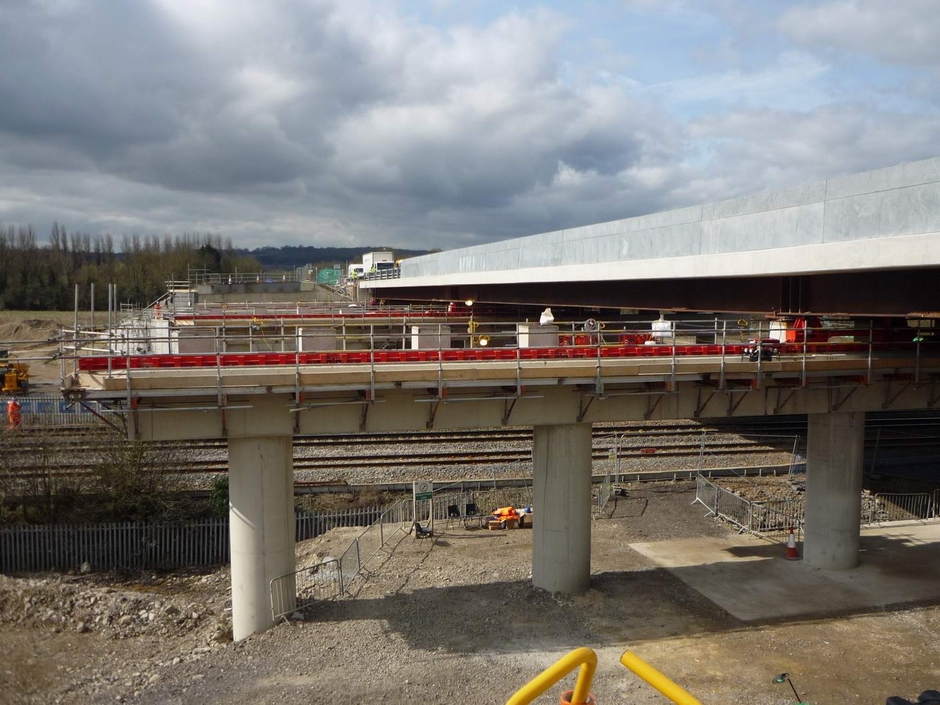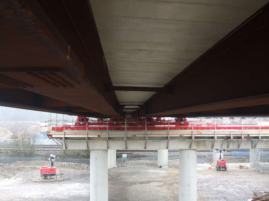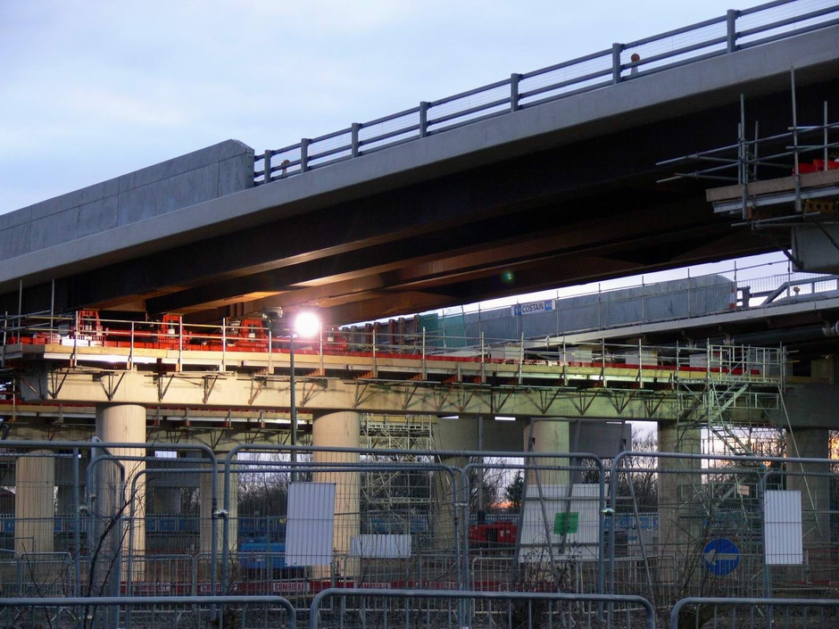 The A34 Wolvercote viaduct in the UK carries a 4 lane highway across a river, a railway line and the A40. The existing 8 span structure was built in the early 1960's and needed to be replaced. To maintain traffic over the viaduct throughout the replacement process a phased demolition and new construction scheme was used. To minimise disruption to traffic a new east carriageway was constructed alongside the existing 4 lane viaduct, followed by demolition of the old east carriageway structure and skidding of the new structure across into final position. DLT were contracted by main contractor Costain Limited to design, supply and operate a hydraulic lifting and skidding system to sideways slide the 254m long, 8 span, 4920 tonne new east carriageway the 16.6m from its construction position into final position on 8 parallel skidding tracks. Skidding, jack down and re-opening of the viaduct took place in a 18 hour overnight road and rail possession using our DL-SU350 bridge sliding system in March 2010.