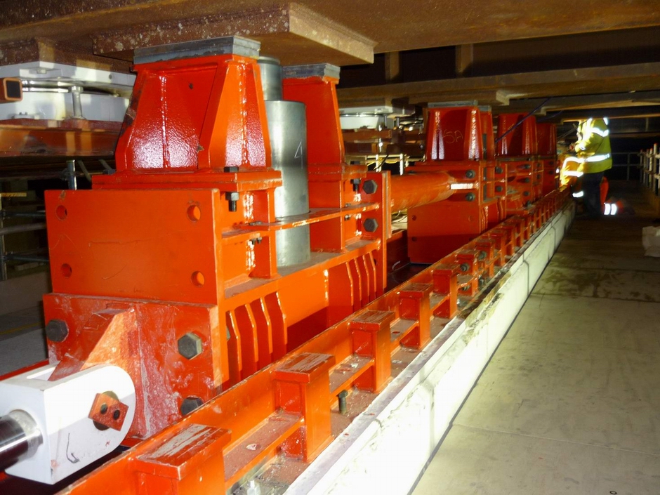 The DL-SU350 bridge sliding system was developed specially for this application and is capable of both vertical jacking and horizontal skidding, with a maximum safe working load at each support point of 350 tonnes. 32 No DL-SU350 units were used for this project, arranged on 8 skid lines with 4 support points for line. The system is capable of maintaining a support point level tolerance of +/- 2mm during skidding and has a movement speed of 7.5 m/hour. For further details please contact us.