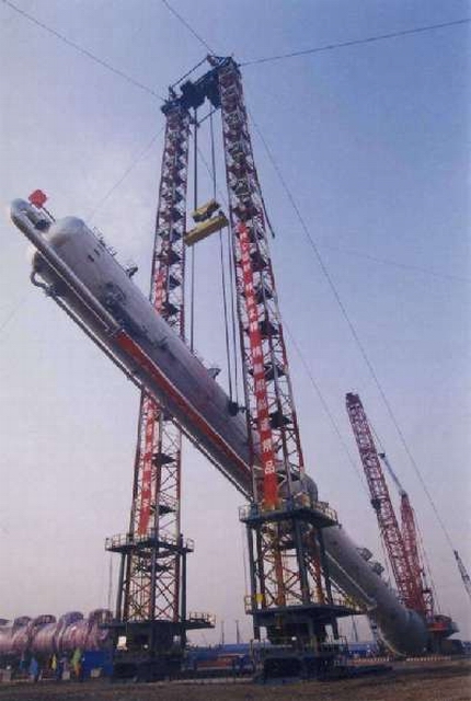 The new system carried out its first lift in early 2003. It was used to erect a 92m long, 763 tonne vessel in a chemical plant on the outskirts of Nanjing, China. (see below).