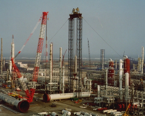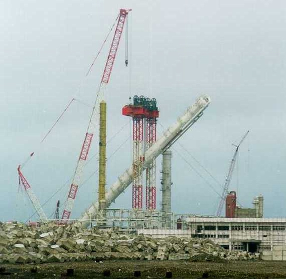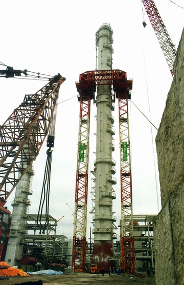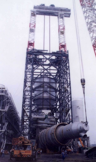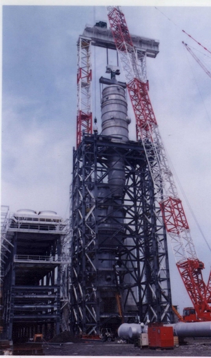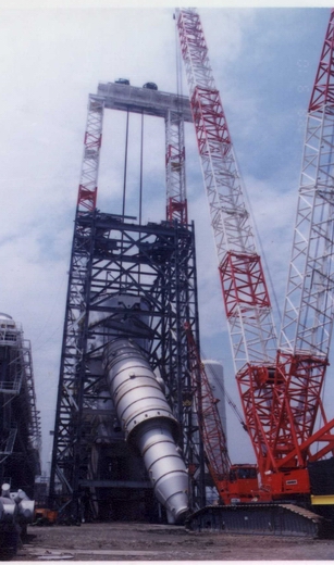 The Formosa Plastics petrochemical plant in Mai-Liao, Taiwan, is one of the largest refineries & chemical plants in the world. All the large vessels, weighing up to 1,557 tonnes and up to 114.5m long, have been erected using a modular jacking tower system designed and supplied by DLT Engineering. To date 58 vessels have been erected with the tower system with a combined weight of 54,000 tonnes. We have also provided site supervisors to oversee the majority of vessel lifts and have carried out vessel specific erection engineering. The jacking tower system uses up to 4 No DL-S580 strand jacks for lifting and 4 No DL-S105 strand jacks for guying and can be used in a number of configurations as shown below. The system is capable of being used without guys for the reaction of vessels up to 35 m tall and 1100 tonnes.