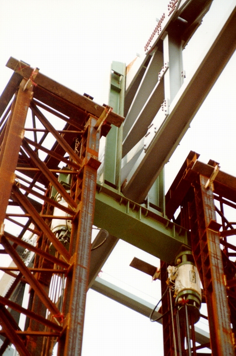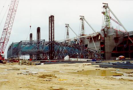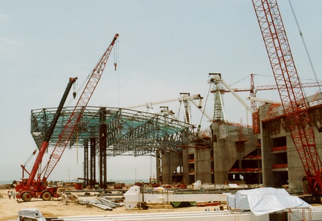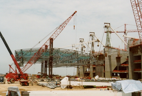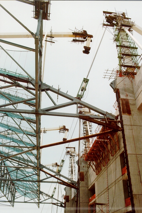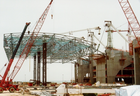 DLT were responsible for the design, supply & operation of a strand jack lifting system together with all associated erection engineering to lift two 1000 tonne roof structures for the HAECO aircraft maintenance facility at Hong Kong’s Chek Lap Kok airport. The roof sections were assembled at ground level for speed and economy and then each was lifted to full height using nine 185 tonne capacity strand jacks. Once lifted to full height the roof was connected along one side to a reinforced concrete core and released from the jacking system.