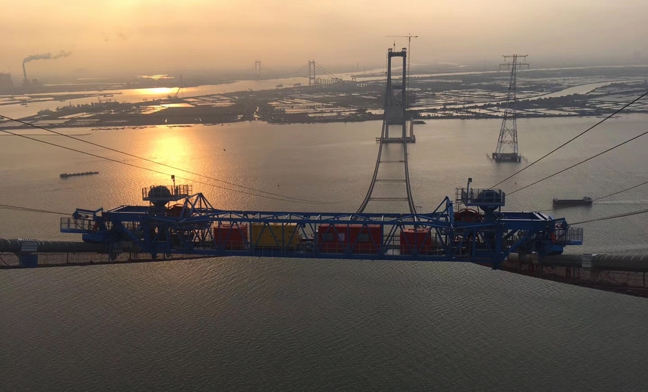 The Humen II Bridge is an asymmetrical suspension bridge with a main span of 1688m and a suspended side span of 658m. The reinforced concrete towers are 257m tall and the main cable spacing is 42.1m. The deck is an aerofoil shaped orthotropic steel box 49.7m wide and 4m deep. DLT were responsible for the concept and detailed design of the 500t SWL deck erection gantries and saddle erection gantry.