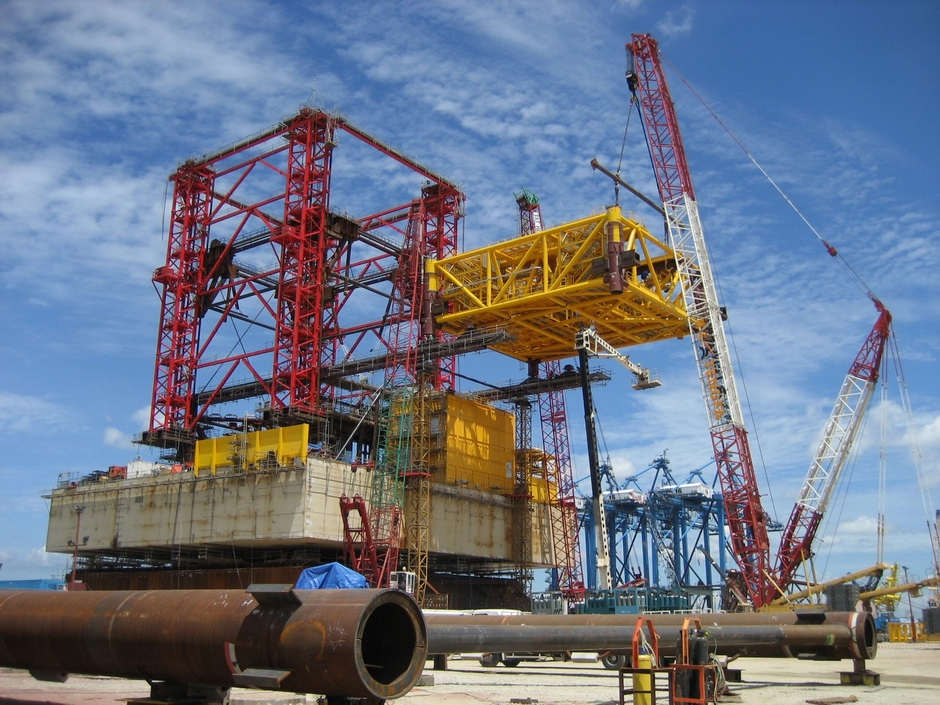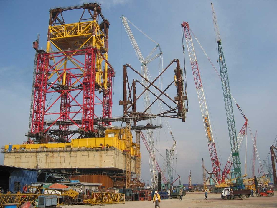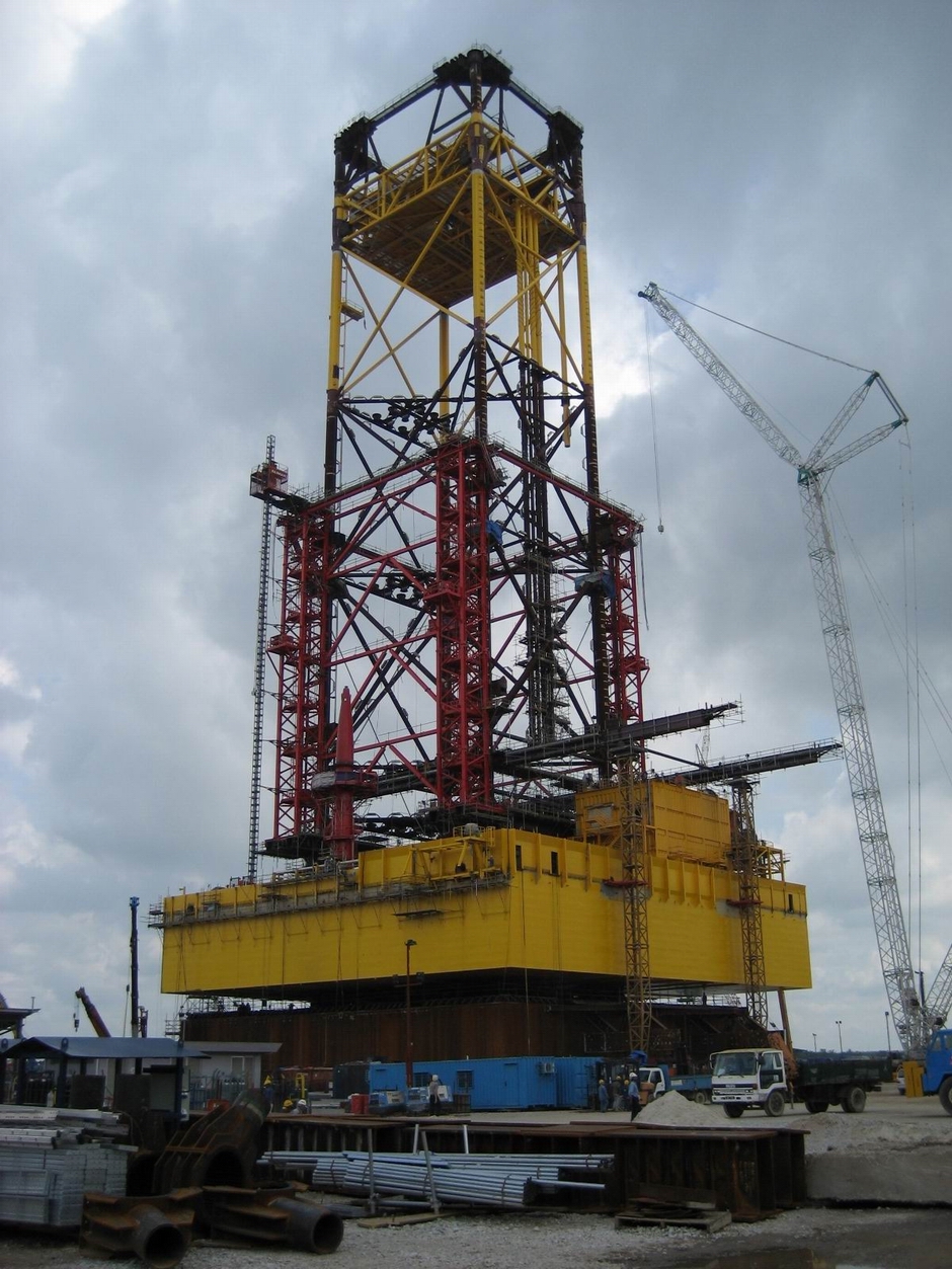 DLT were sub-contracted to design, supply and operate a skidding and jacking system to incrementally erect the 26m x 22m x 140m high 2800 tonne jacket structure. The jacket was erected in 8 sections, weighing up to 660 tonnes each. The bottom section was erected onto the platform base by crane and used to support the skid system and jacking tower system for erection of the top 7 sections. Starting with the top jacket section, the remaining 7 sections were lifted onto a skid track one at a time and moved into position for lifting. The sections were lifted using our DL-TS3000 Mk1 jacking tower system, in 4 tower configuration and using 8 No DL-C450 climbing jacks. As each section was lifted the next section was skidded beneath and the jacket legs welded together. The combined sections were then lifted by the tower system. This process was repeated until the top 7 sections were supported on the tower system, weighing a total of 2400 tonnes. The tower system was then used to lower the top 7 sections onto the bottom section and align the leg joints for welding. Jacket erection took place from October to December 2007 and the finished jacked was surveyed as being plumb to within 10mm at the end of our jacking operations.