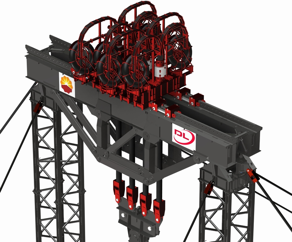 Strand guides, recoilers, DL-L320V/2/300/D power pack and DL-CP400 pinned skidding jacks on tower top