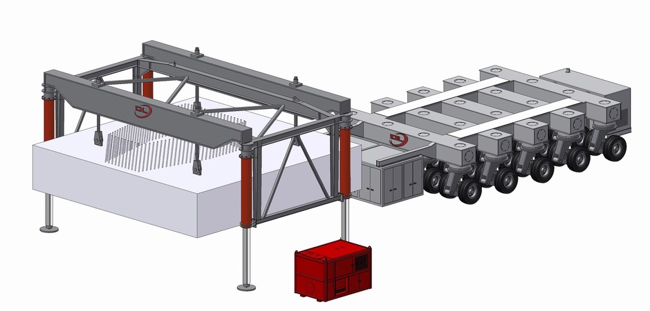 The Main Contractor needed a solution for transporting the precast units around the casting yard that would be as compact as a ground level skid system, but as fast and flexible as a self propelled modular transporter (SPMT). Standard SPMTs were considered for the project, but would be too long to turn within the narrow confines of the site. The DL-MT1000 Mega Transporter provided the perfect solution. The DL-MT1000 uses aerospace tyres to give 4 to 5 times the load carrying capacity per axle line of a conventional SPMT, and as a result is much shorter. The DL-MT1000 is controlled by an operator that walks along side the transporter using a wireless control unit. It is able to drive around a curve, drive diagonally and rotate about its centre point (carousel) at a full load speed of 1 km/hr and an unloaded speed of 3 km/hr. For this project the DL-MT1000 is supplied with an electric motor driven hydraulic power pack that is powered using a locally hired diesel generator.