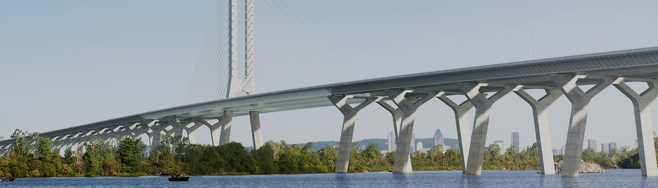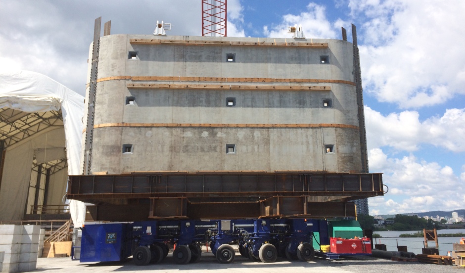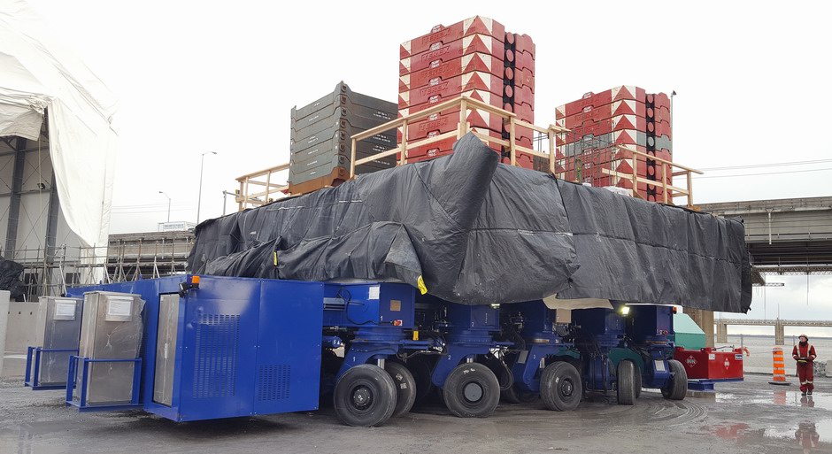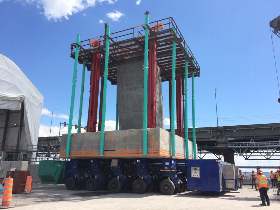 In August 2015 DLT were awarded the contract by Main Contractor Signature On The St Lawrence Construction Group to supply a DL-MT1000 Mega Transporter and a 1000 tonne capacity 2.5m stroke jack up system for handling precast concrete sections of the New Champlain Bridge side spans. The system was delivered in February 2016. The bridge footings and piers of the side spans were precast on land and then placed into position by a floating crane. The precast footing and pier units weigh up to 1000 tonnes and are up to 11.37m high. The equipment was delivered to site and commissioned in February 2016 .