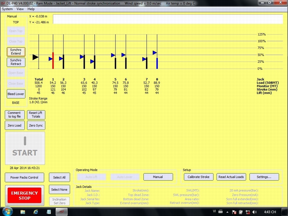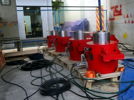 In March 2014 DLT Engineering supplied a 3600 tonne capacity computer controlled weighing system to Petro Vietnam Technical Services Corporation (PTSC) through Phong Viet. The system consists of 4 No 600 tonnes DL-WJ600 and 4 No 300 tonnes DL-WJ300 weighing jacks, all synchronised, controlled and operated by a single operator using our proven DL-P40 computer control system. The jacks were provided with load cells and the overall accuracy of the system was less than 0.5%.