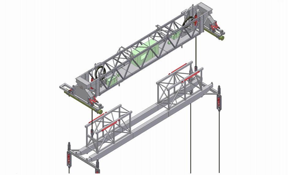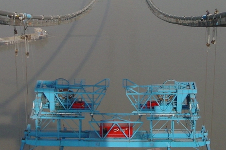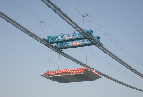 The deck erection gantries for the 1490m span Runyang suspension bridge were designed and supplied by DLT Engineering to RBG. 2nd Highway Engineering Bureau, the main contractor for the project. The main span of the steel bridge deck was been split unto 47 deck units, each weighing up to 470 metric tonnes. These were fabricated offsite and transported by barge into position under the main cables where they were erected using the deck erection gantries.