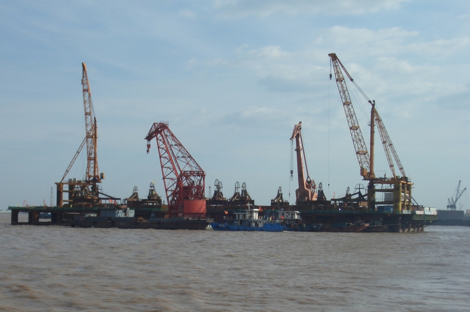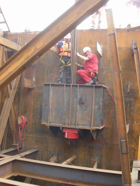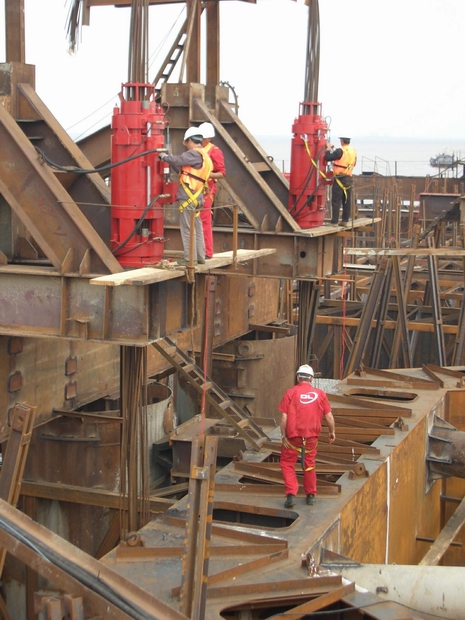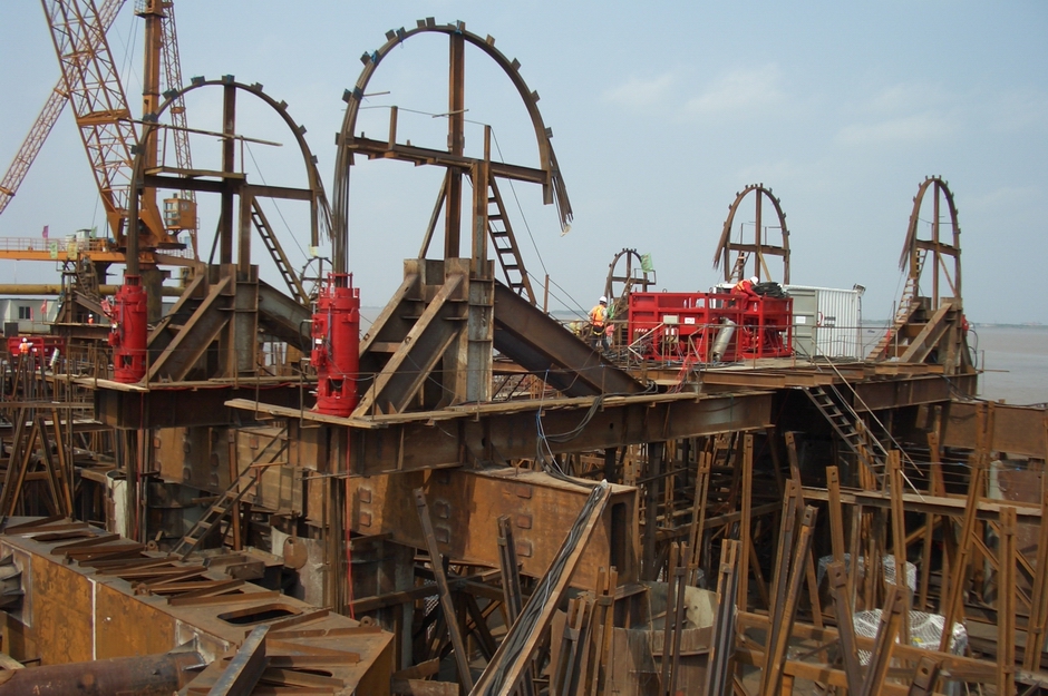 The Sutong bridge across the Yangtze river near Shanghai has a main span of 1088m, which made it the longest cable stay bridge in the world until 2012. Construction of the 118m x 52.3m x 18m thick pile cap to the main cable pylon P4 was undertaken by CHEC.2nd Navigation Engineering Bureau, the main contractor for the north side foundations and approach spans. The reinforced concrete pile cap is supported on 135 No. 2.85m diameter steel piles and has a 2m thick permanent steel caisson to the sides which is designed to minimise damage to the pile cap during ship impact. This steel caisson also acted as permanent formwork for casting of the pile cap concrete. The bottom 7m of the caisson was assembled above water level on temporary support brackets welded to the piles, and then carefully lowered into the water using strand jacks. DLT were heavy lift sub-contractors to CHEC for this lowering operation, which took place on October 19th 2004.