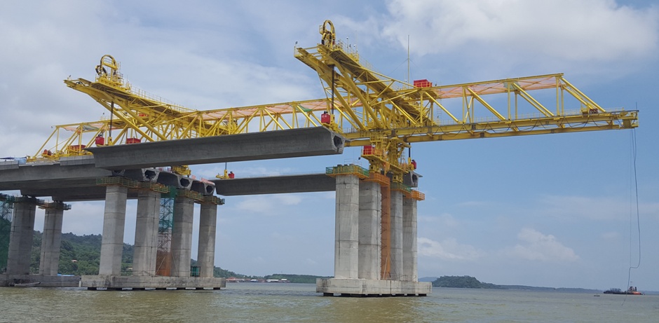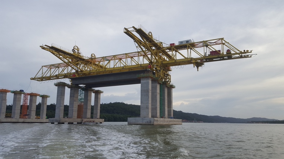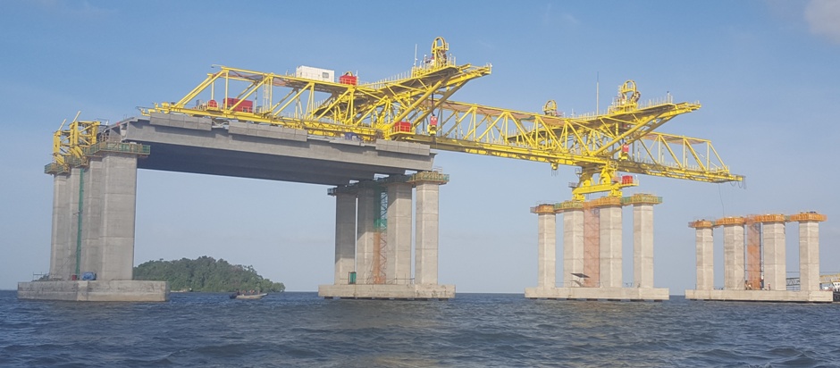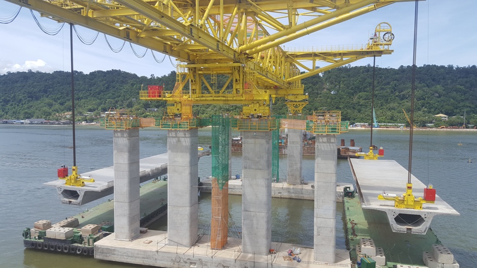 DLT Engineering designed and supplied an innovative 2 x 870 tonne capacity bridge deck erection gantry for the Temburong Bridge Project in Brunei, to main contractor Daelim-Swee. The gantry was used to simultaneously erect two 50m long 870 tonne precast concrete bridge deck girders, and it is believed to be the first ever bridge erection gantry of this type. It was used to erect all bridge deck girders on a 13.65 km long marine viaduct across the Brunei Bay that links the regions of Brunei Muara and Temburong. The gantry erected the first pair of bridge girders in January 2017 and was in operation on the project for 2 years. The gantry was designed to erect viaduct sections that are up to four decks wide in some sections at an erection rate of one bridge span every 2 shifts.