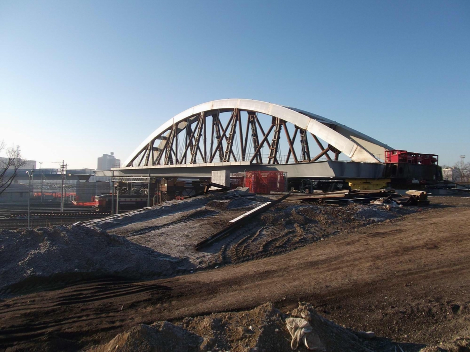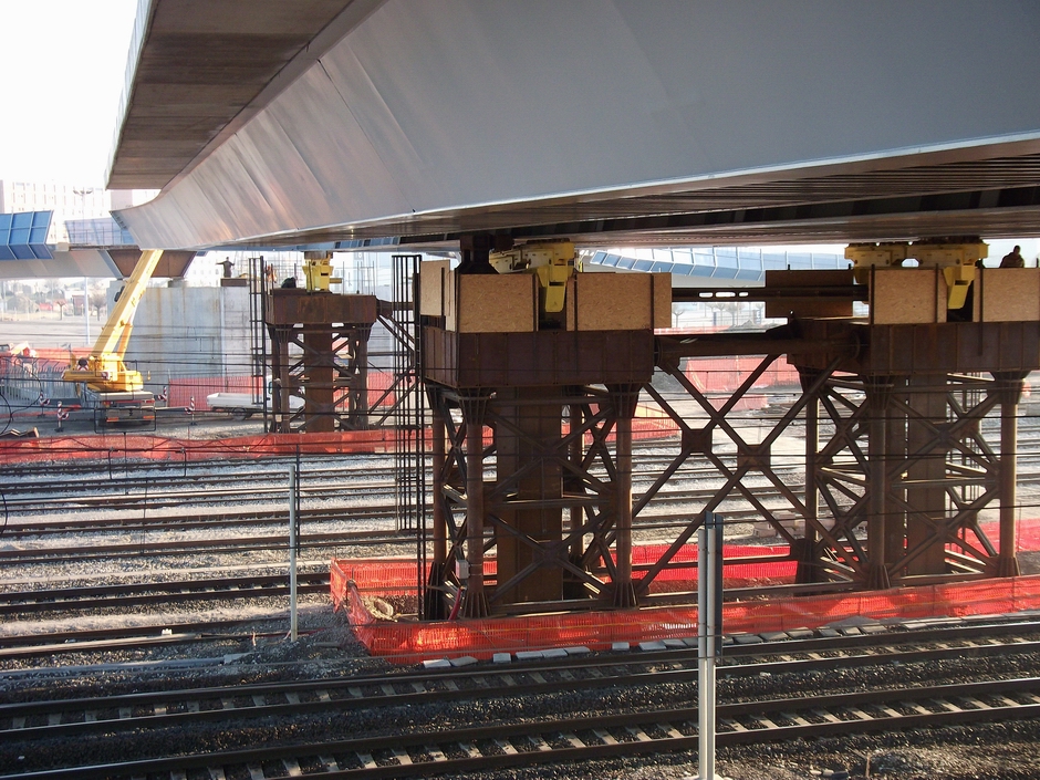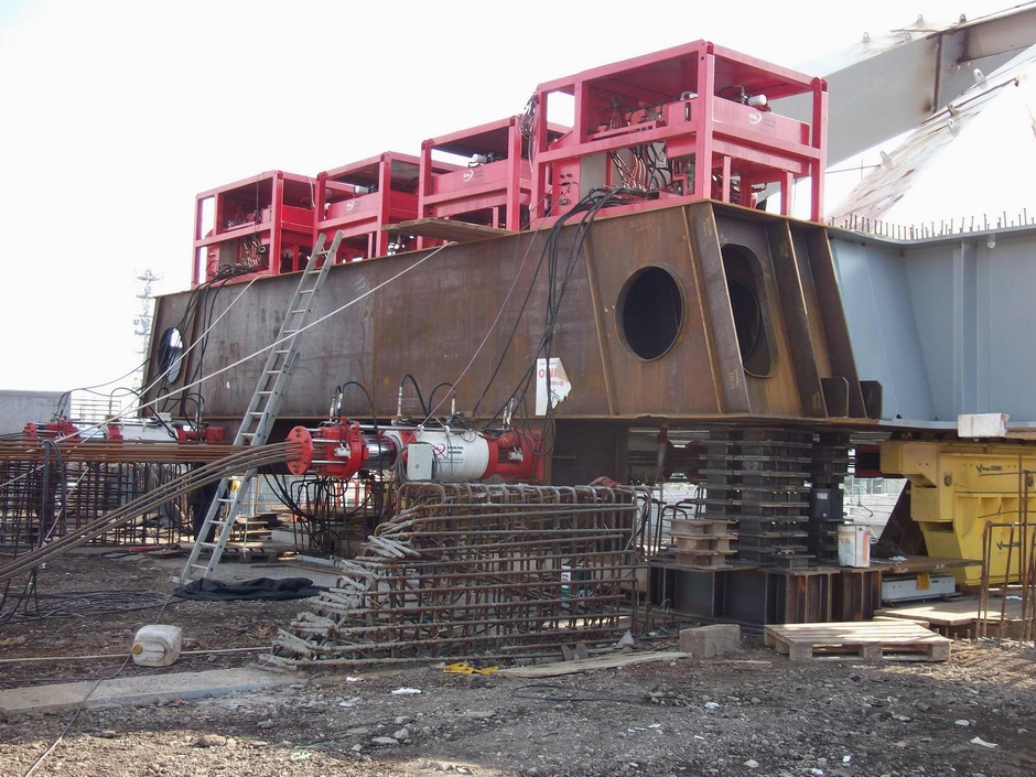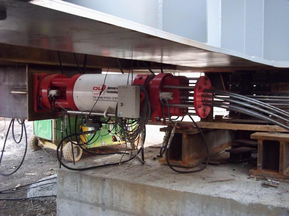 In early 2011 the 1000 tonne superstructure of the Ponte Verde steel arch bridge in Padua, Italy, was launched into place by Edimo Metallo S.p.A using Dorman Long DL-S185 strand jacks and with the assistance of our construction engineering and site supervision services. The complete arch bridge was fully assembled on site and then launched over the 90m span into final position, crossing 10 No railway lines that remained open throughout. Within the 90m span there were 2 No temporary supports for launching, located between the railway lines. 2 No DL-S185 strand jacks were used for pulling and a further 2 No DL-S185 strand jacks used to restrain the bridge from running away down the small slope and to allow the launch to be reversed in an emergency. The pulling and restraining strand jacks were hydraulically interlocked so that a drop in pressure in the pulling jacks caused by the bridge running away down the slope would immediately lock the restraining strand jacks to prevent further uncontrolled movement. The DL-S185 strand jacks were powered by 4 No DL-L30/2/300/E power packs and controlled using our DL-P40 computer control system. The launch took place in several stages over a 5 day period. We provided two teams of supervisors to give 24 hour cover for the operation.