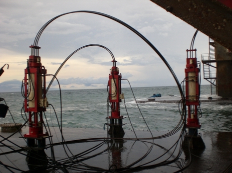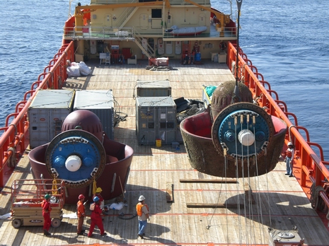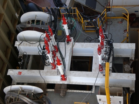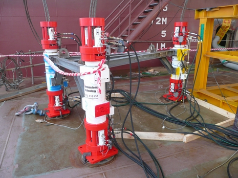 Stena Tay semi-submersible rig. 3 no DL-S62 strand jacks loaded on the deck for thruster replacement.